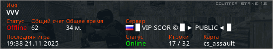 Играет на Counter Strike 1.6 сервере. Страна: РоссияПервый раз замечен 18:59 10.11.2025