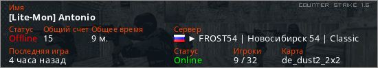 Играет на Counter Strike 1.6 сервере. Страна: РоссияПервый раз замечен 13:32 10.04.2026