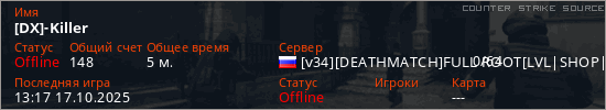 Играет на Counter Strike Source сервере. Страна: РоссияПервый раз замечен 13:13 17.10.2025