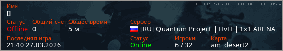 Играет на Counter Strike Global Offensive сервере. Страна: РоссияПервый раз замечен 21:35 27.03.2026