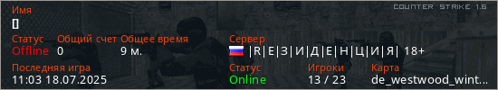 Играет на Counter Strike 1.6 сервере. Страна: РоссияПервый раз замечен 11:35 16.07.2025