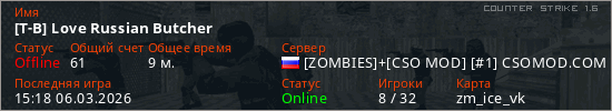 Играет на Counter Strike 1.6 сервере. Страна: РоссияПервый раз замечен 12:03 06.03.2026