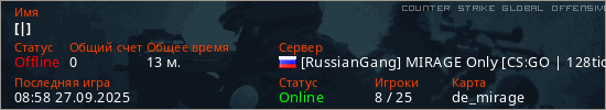 Играет на Counter Strike Global Offensive сервере. Страна: РоссияПервый раз замечен 15:04 23.09.2025