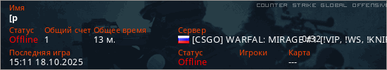 Играет на Counter Strike Global Offensive сервере. Страна: РоссияПервый раз замечен 14:16 13.10.2025