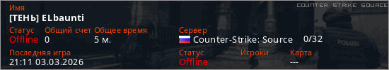 Играет на Counter Strike Source сервере. Страна: РоссияПервый раз замечен 20:48 03.03.2026