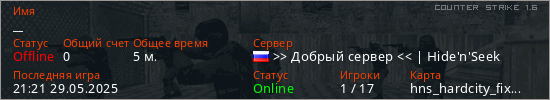 Играет на Counter Strike 1.6 сервере. Страна: РоссияПервый раз замечен 21:19 29.05.2025