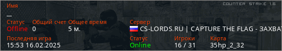 Играет на Counter Strike 1.6 сервере. Страна: РоссияПервый раз замечен 15:51 16.02.2025