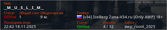Играет на Counter Strike Source сервере. Страна: РоссияПервый раз замечен 16:25 14.11.2025