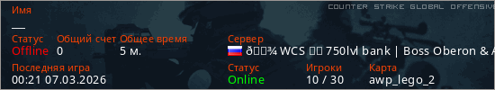 Играет на Counter Strike Global Offensive сервере. Страна: РоссияПервый раз замечен 00:14 07.03.2026