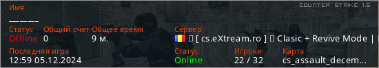 Играет на Counter Strike 1.6 сервере. Страна: РумынияПервый раз замечен 00:33 25.10.2024