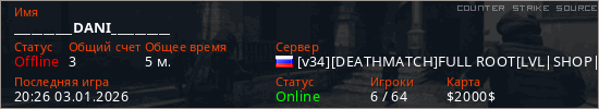 Играет на Counter Strike Source сервере. Страна: РоссияПервый раз замечен 20:24 03.01.2026