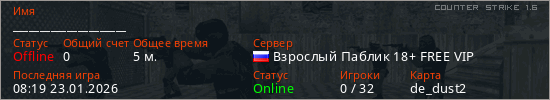 Играет на Counter Strike 1.6 сервере. Страна: РоссияПервый раз замечен 08:12 23.01.2026