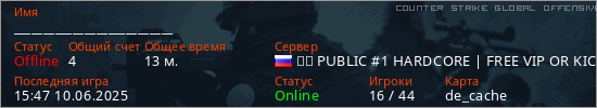 Играет на Counter Strike Global Offensive сервере. Страна: РоссияПервый раз замечен 16:58 05.06.2025