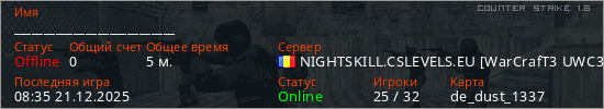 Последний раз был в сети 08:35 21.12.2025 Игрок с таким ником замечен на 12 серверах