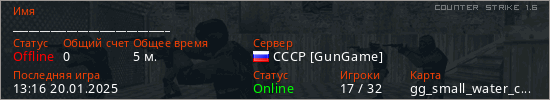 Играет на Counter Strike 1.6 сервере. Страна: РоссияПервый раз замечен 13:14 20.01.2025
