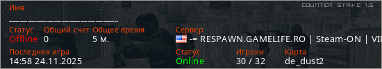 Играет на Counter Strike 1.6 сервере. Страна: СШАПервый раз замечен 14:54 24.11.2025