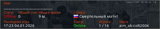 Играет на Counter Strike 1.6 сервере. Страна: РоссияПервый раз замечен 18:25 02.01.2026