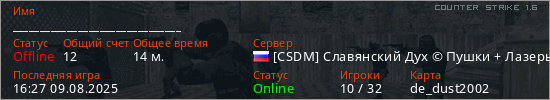 Играет на Counter Strike 1.6 сервере. Страна: РоссияПервый раз замечен 10:11 03.05.2025