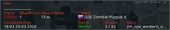 Играет на Counter Strike 1.6 сервере. Страна: РоссияПервый раз замечен 16:37 29.03.2026