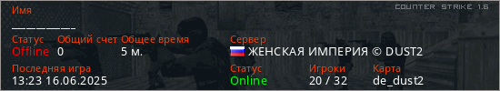 Играет на Counter Strike 1.6 сервере. Страна: РоссияПервый раз замечен 13:21 16.06.2025