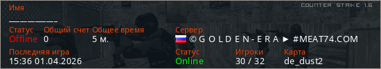 Играет на Counter Strike 1.6 сервере. Страна: РоссияПервый раз замечен 15:13 01.04.2026