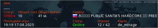 Играет на Counter Strike Global Offensive сервере. Страна: РоссияПервый раз замечен 17:19 02.08.2025