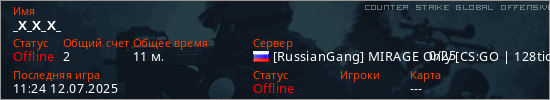 Играет на Counter Strike Global Offensive сервере. Страна: РоссияПервый раз замечен 20:41 11.07.2025
