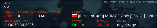 Играет на Counter Strike Global Offensive сервере. Страна: РоссияПервый раз замечен 11:30 30.04.2025