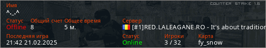 Играет на Counter Strike 1.6 сервере. Страна: РумынияПервый раз замечен 21:13 21.02.2025