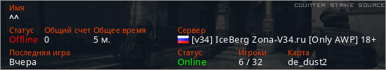 Играет на Counter Strike Source сервере. Страна: РоссияПервый раз замечен 01:35 12.04.2026
