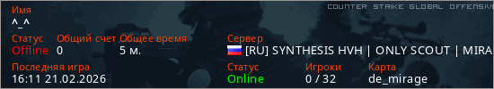 Играет на Counter Strike Global Offensive сервере. Страна: РоссияПервый раз замечен 15:54 21.02.2026