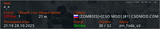 Играет на Counter Strike 1.6 сервере. Страна: РоссияПервый раз замечен 17:48 17.04.2025