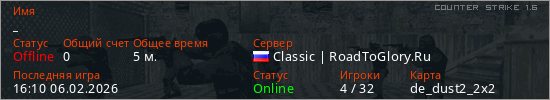 Играет на Counter Strike 1.6 сервере. Страна: РоссияПервый раз замечен 15:24 06.02.2026