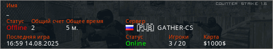 Играет на Counter Strike 1.6 сервере. Страна: РоссияПервый раз замечен 16:57 14.08.2025