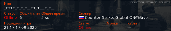 Играет на Counter Strike Source сервере. Страна: РоссияПервый раз замечен 21:05 17.09.2025