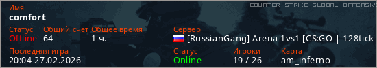 Играет на Counter Strike Global Offensive сервере. Страна: РоссияПервый раз замечен 18:36 18.02.2026