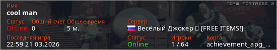 Играет на Team Fortress 2 сервере. Страна: РоссияПервый раз замечен 22:46 21.03.2026