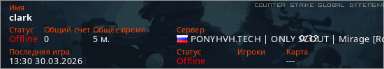 Играет на Counter Strike Global Offensive сервере. Страна: РоссияПервый раз замечен 13:17 30.03.2026