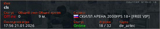 Играет на Counter Strike 1.6 сервере. Страна: РоссияПервый раз замечен 16:58 21.01.2026