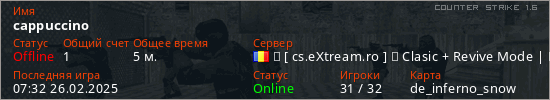 Играет на Counter Strike 1.6 сервере. Страна: РумынияПервый раз замечен 07:30 26.02.2025