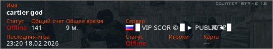 Играет на Counter Strike 1.6 сервере. Страна: РоссияПервый раз замечен 22:54 17.02.2026