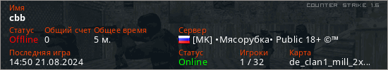 Играет на Counter Strike 1.6 сервере. Страна: РоссияПервый раз замечен 14:30 21.08.2024