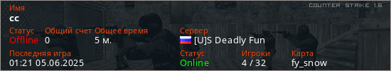 Играет на Counter Strike 1.6 сервере. Страна: РоссияПервый раз замечен 18:57 04.06.2025