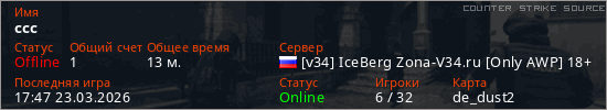 Играет на Counter Strike Source сервере. Страна: РоссияПервый раз замечен 15:54 23.03.2026