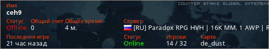Играет на Counter Strike Global Offensive сервере. Страна: РоссияПервый раз замечен 20:00 04.03.2026