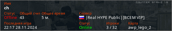 Последний раз был в сети 22:17 28.11.2024 Игрок с таким ником замечен на 15 серверах