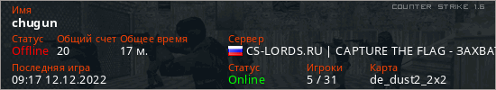 Играет на Counter Strike 1.6 сервере. Страна: РоссияПервый раз замечен 06:51 12.12.2022