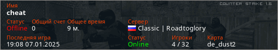 Играет на Counter Strike 1.6 сервере. Страна: РоссияПервый раз замечен 19:05 26.12.2024