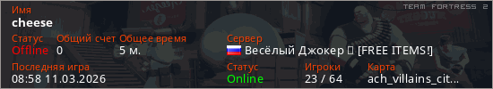 Играет на Team Fortress 2 сервере. Страна: РоссияПервый раз замечен 08:00 11.03.2026
