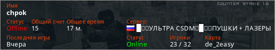Играет на Counter Strike 1.6 сервере. Страна: РоссияПервый раз замечен 03:13 30.03.2026